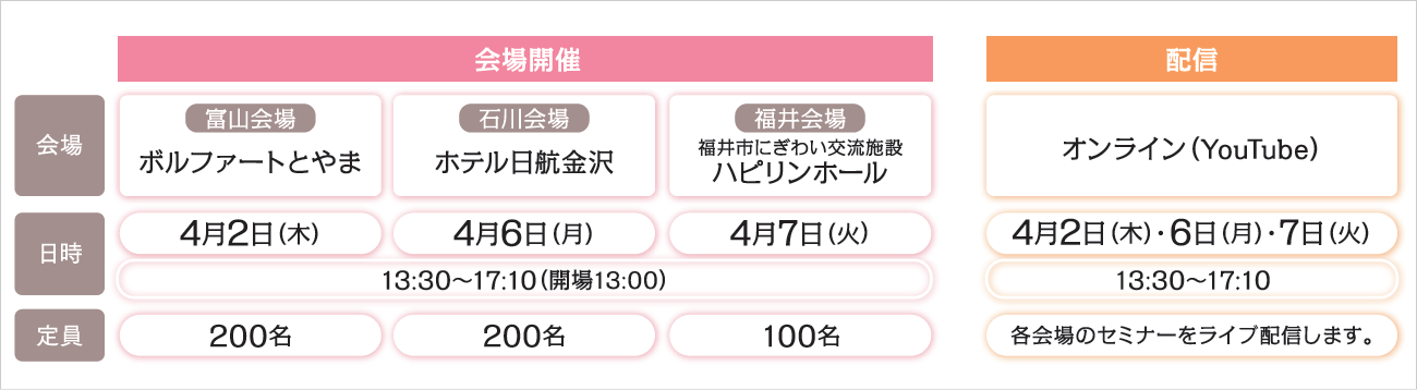 - ※会場開催は定員となり次第申し込みを締め切らせていただきます。お早めにお申し込みください。